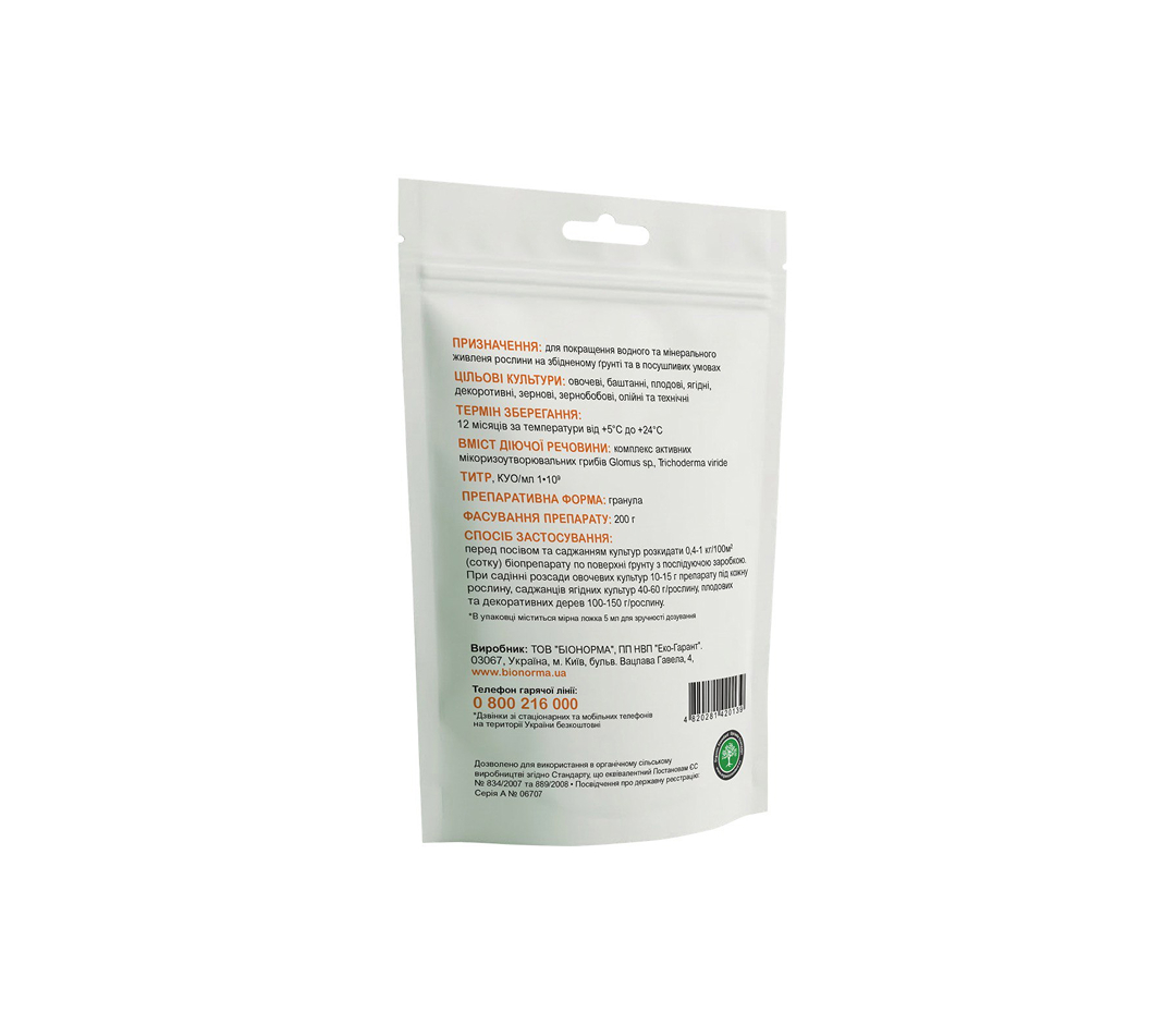 Ретельно підібраний склад активних мікоризоутворювальних грибів Glomus sp., Triсhoderma viride унаслідок утворення симбіотичної асоціації з кореневою системою та проникнення всередину кореневих волосків рослини збільшують корисну площу кореня і, відповідно, його поглинальну здатність. Співіснуючи разом з грибом, рослина краще пристосовується до несприятливих умов навколишнього середовища, зокрема, вона менш чутлива до посухи та отримує повноцінне живлення навіть в умовах збідненого ґрунту. Міцелій гриба надійно захищає підземну частину рослинного організму від проникнення чужорідних фітопатогенних бактерій та грибів